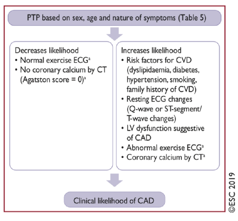 This pre-test probability can be further modified by applying other known clinical risk markers such as smoking and lipid status, ECG changes, coronary CT, carotid ultrasound, etc., and can be correspondingly diminished or augmented to give a clinical likelihood ratio (Figure 3) for obstructive CAD.